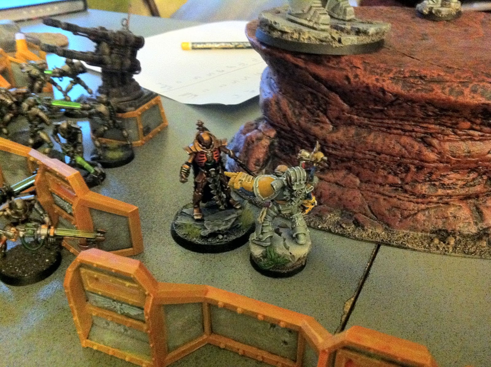 Como se puede ver en el vídeo ha sido una auténtica paliza, y eso que tras robarle la iniciativa creí que le podría plantar cara por fin a estos Necrones que me han ganado las cuatro partidas que he jugado contra ellos, y por extensión contra Tulark (primera, segunda, y tercera). La verdad es que confiaba en sacar más rendimiento a mi primer turno pero la suerte no me acompañó, sobretodo con lo veteranos que se murieron por el terreno peligroso y luego no fueron capaces de cargarse el Acechante. De todas formas creo que mi despliegue fue defectuoso, y es que con tantas miniaturas es difícil aclararse, porque me vi obligado a dividir demasiado mi fuego en lugar de concentrarlo en un punto.
