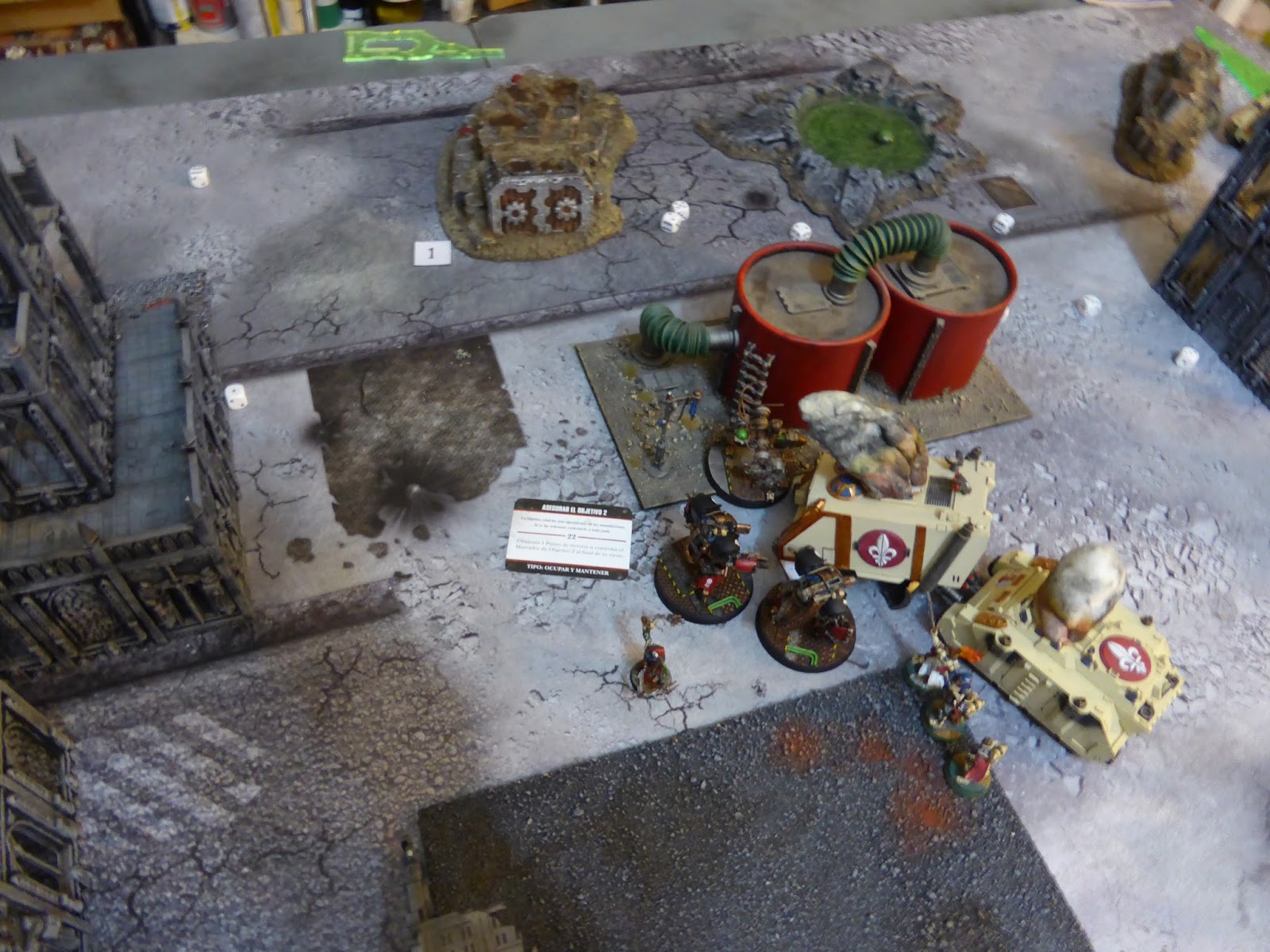 Informe: La tecnoguardia del Magos Arístides avanzó en bloque para empezar a establecer su control sobre el campo de batalla. Sin embargo las unidades más retrasadas: el Onagro, la pequeña unidad de Skitarii y la escuadra del general, tuvieron que retroceder para lograr uno de sus objetivos. Los dispararon en esta fase no fueron más que tanteos de aproximación que únicamente lograron algunas bajas dispersas. En su primer turno el Mechanicum logró hacerse con 2 puntos de victoria por