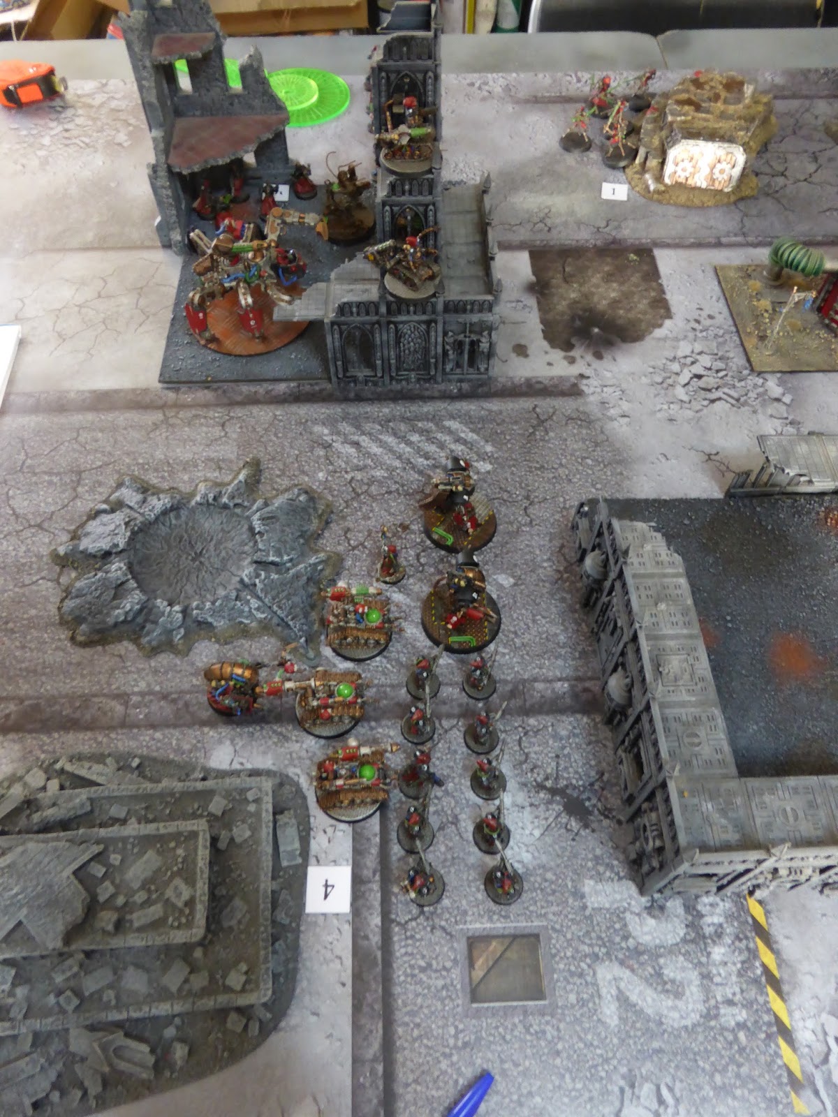 Aunque el Mechanicum llevaba la iniciativa del enfrentamiento, estaba sufriendo muchas bajas y comenzaba a resentirse. En su cuarto turno los Kastellan se encargaron de las Arrepentidas cargado contra ellas y despedazándolas con sus puños mecánicos. En esas mismas ruinas la escuadra táctica de las Sororitas recibió las atenciones del Magos que eliminó a dos hermanas y, tratando de hacer huir al resto, ordenó a los Kataphron que no abrieran fuego. Sin embargo las supervivientes se mantuvieron firmes. En el flanco contrario el Onagro eliminaba a algunas miembros de la escolta de la Canonesa, pero estas también se negaban a huir. A pesar de ver algunos de sus planes truncados el Mechanicum logró hacerse con 3 PV en su cuarto turno: