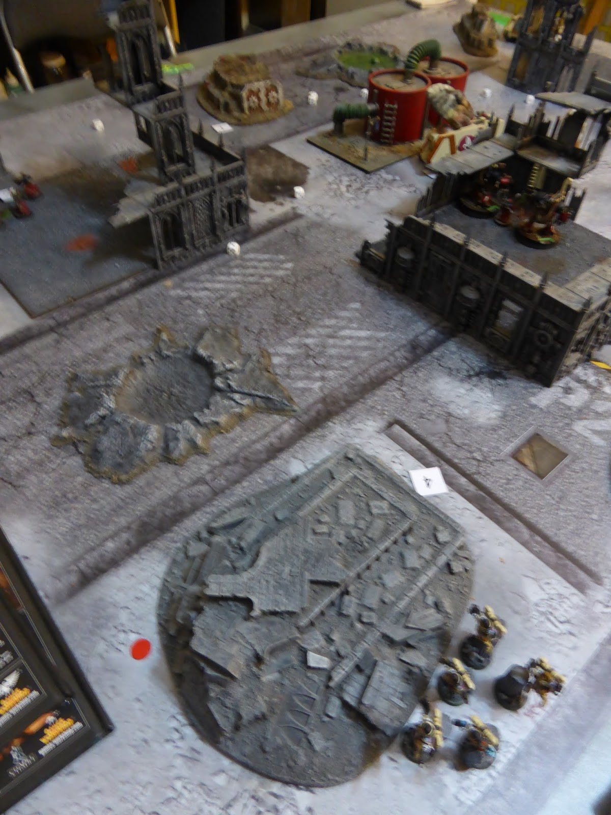 Tras volver de entre los muertos la Santa celestina sobrevoló los depósitos de Promethium para a continuación asaltar y masacrar a la escuadra de Sikitarii del flanco derecho de las Hermanas. Cerca de allí los Sicarians recibían las atenciones de un Exorcista y de la escuadra de la Canonesa, pero sin ser totalmente destruidos. El Rhino atravesó los restos del Inmolator para controlar el objetivo central, no sin que antes la escuadra táctica que viajaba en su interior descendiera para abrir fuego contra los Rangers escondidos entre las ruinas, dejando sólo a un puñado con vida. Finalmente las Dominium se centraron en los Balistarii, abriendo fuego contra ellos y asaltándoles a continuación, destruyendo así a dos de ellos. En su segundo turno las Hermanas de Batalla empataron la contienda consiguiendo 3 PV: