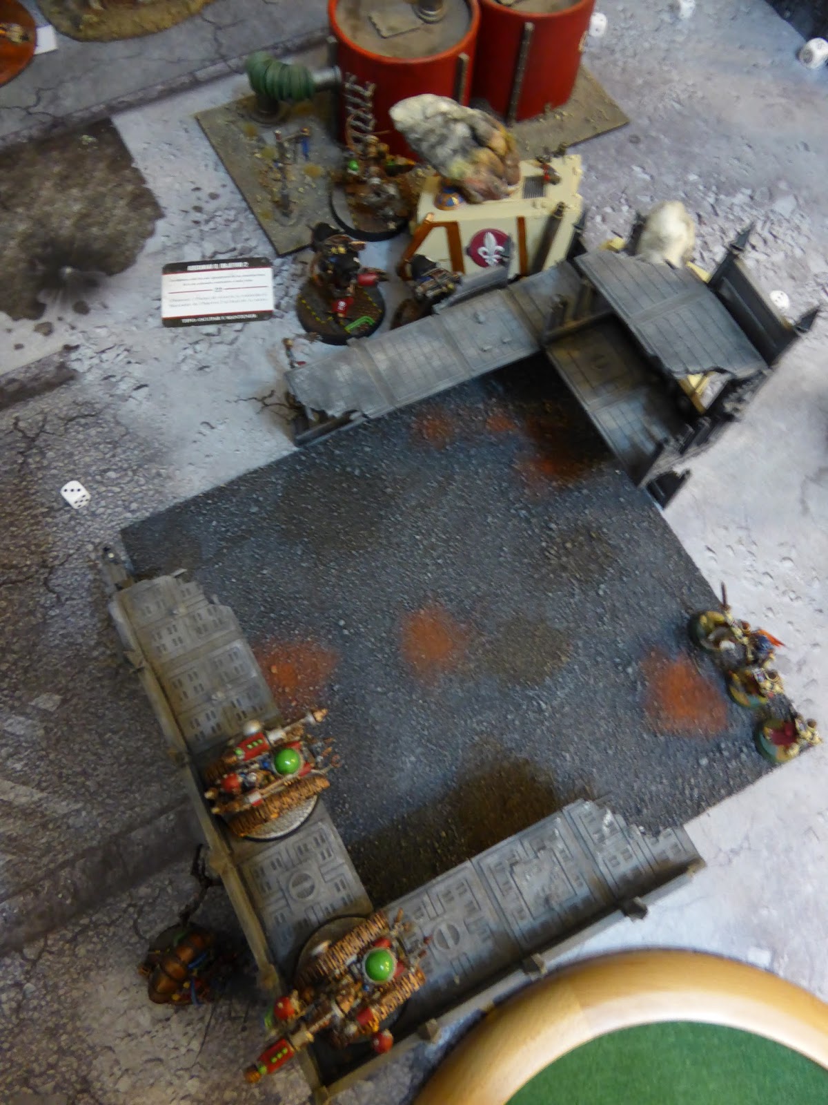 Con las bajas sufridas el turno anterior el Mechanicum tenía muy poco margen de maniobra. Los Kastellan entraron en las ruinas para acabar con la escuadra táctica de una vez por todas mientras el Balistarii superviviente se escondía entre los restos de los vehículos enemigos. En su quinto turno el Mehcnicum solo pudo hacerse con 1 PV por